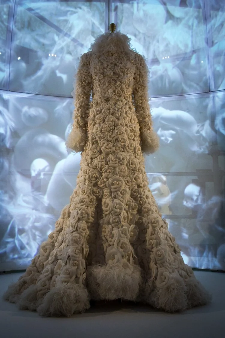 The exhibition was organized into sections such as embroidery, pleating, lacework, embellishments (such as artificial flowers and featherwork), and more. In some of the garments, the reflection of the details are projected onto the wall and ceiling giving the work of art more drama.